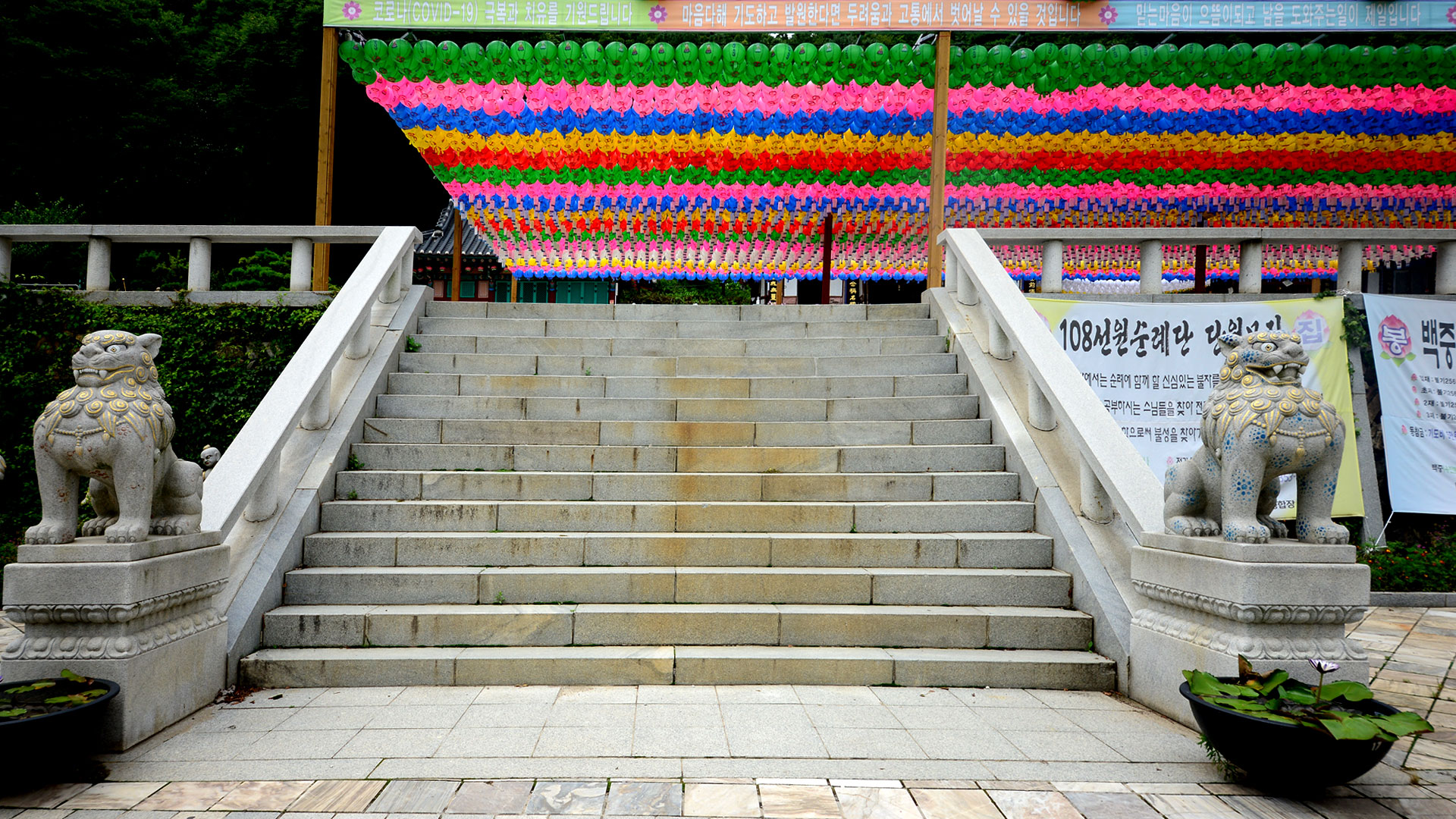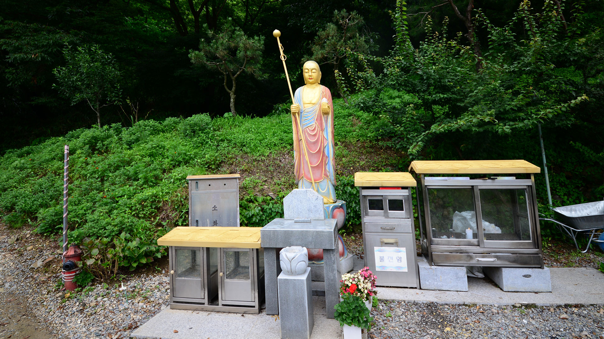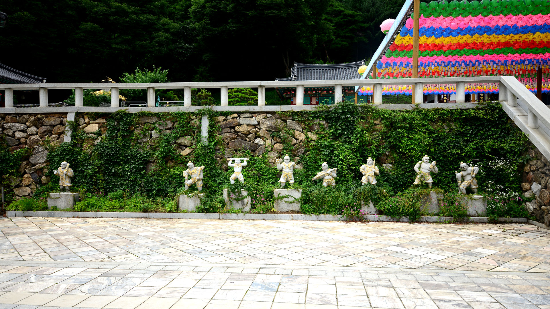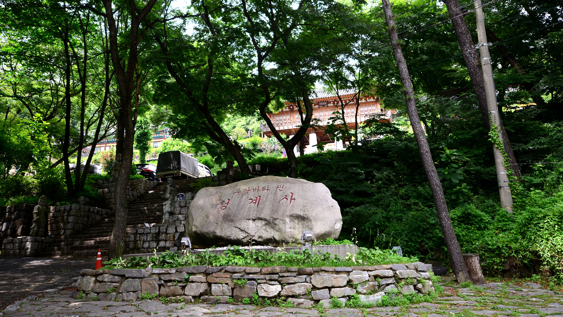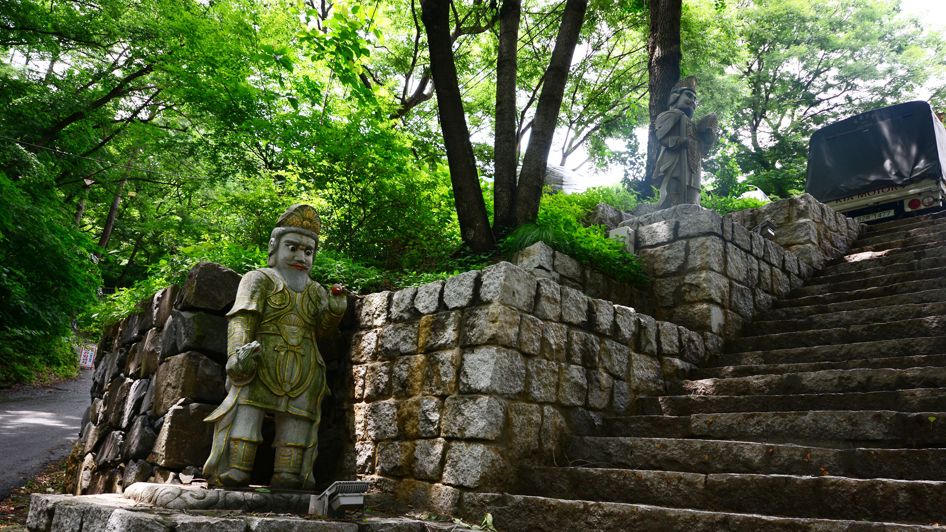 청게사는 일주문이 없고 진입 계단 좌 우에 석조 사천왕이 자리하고있다