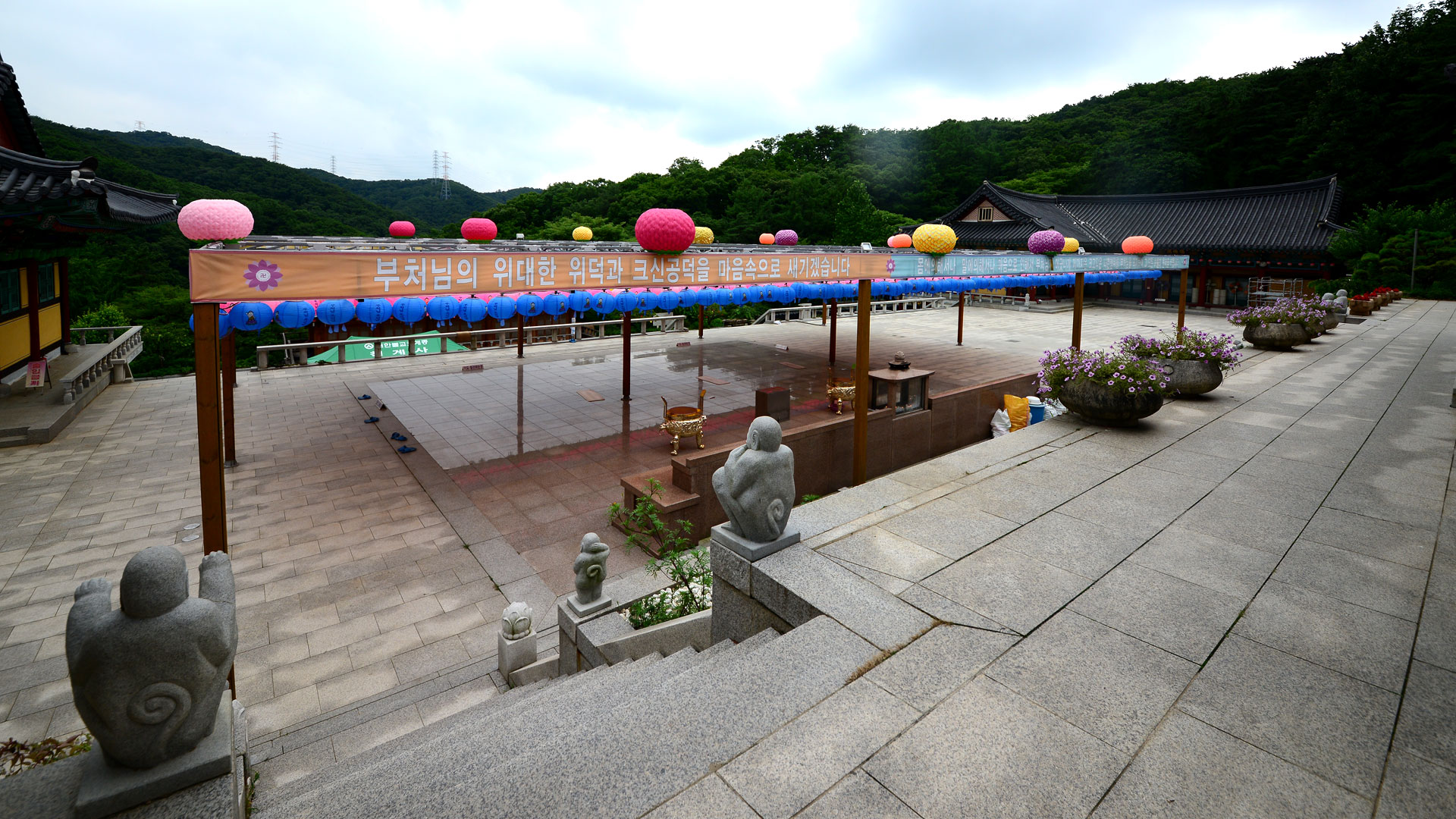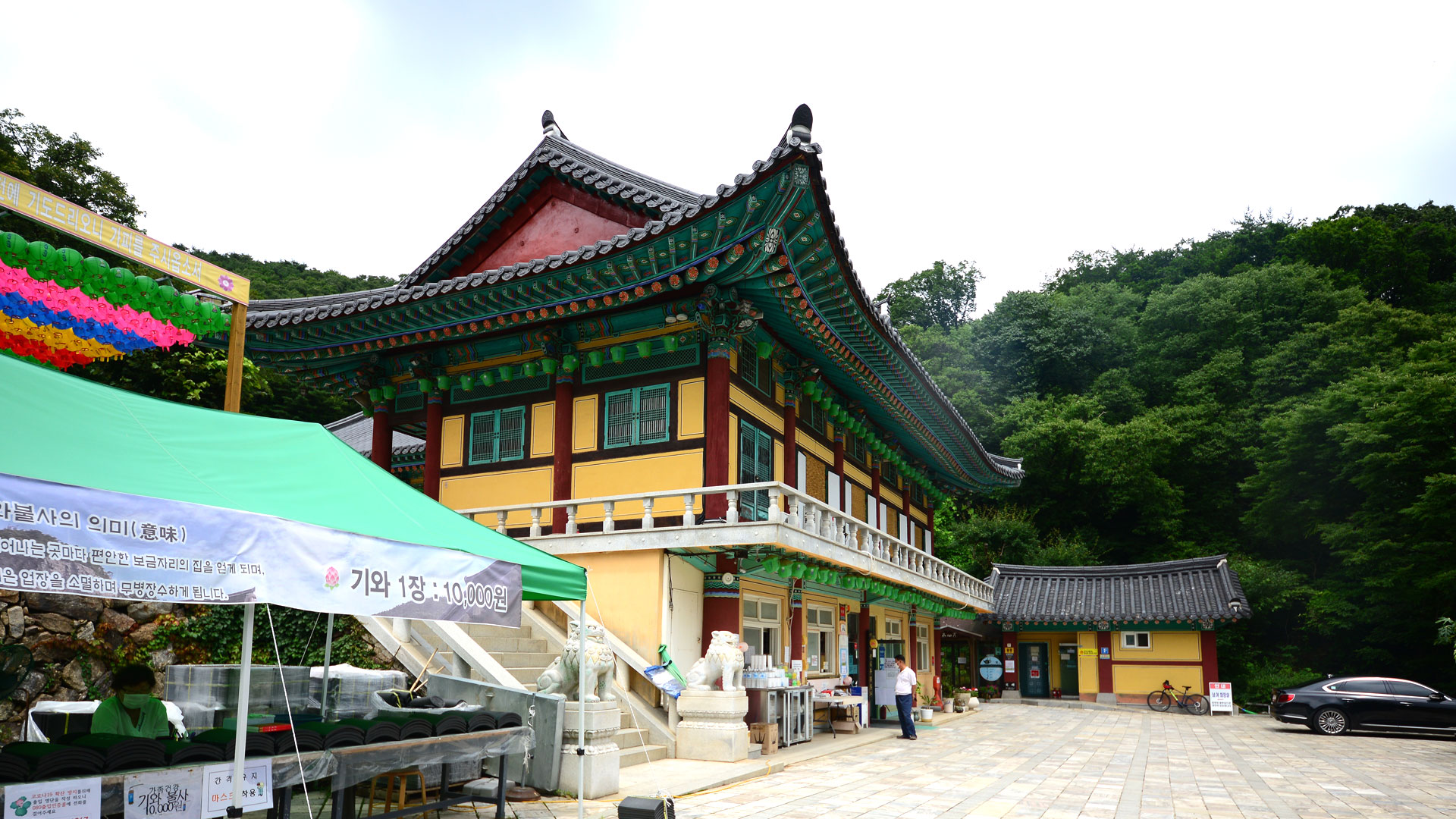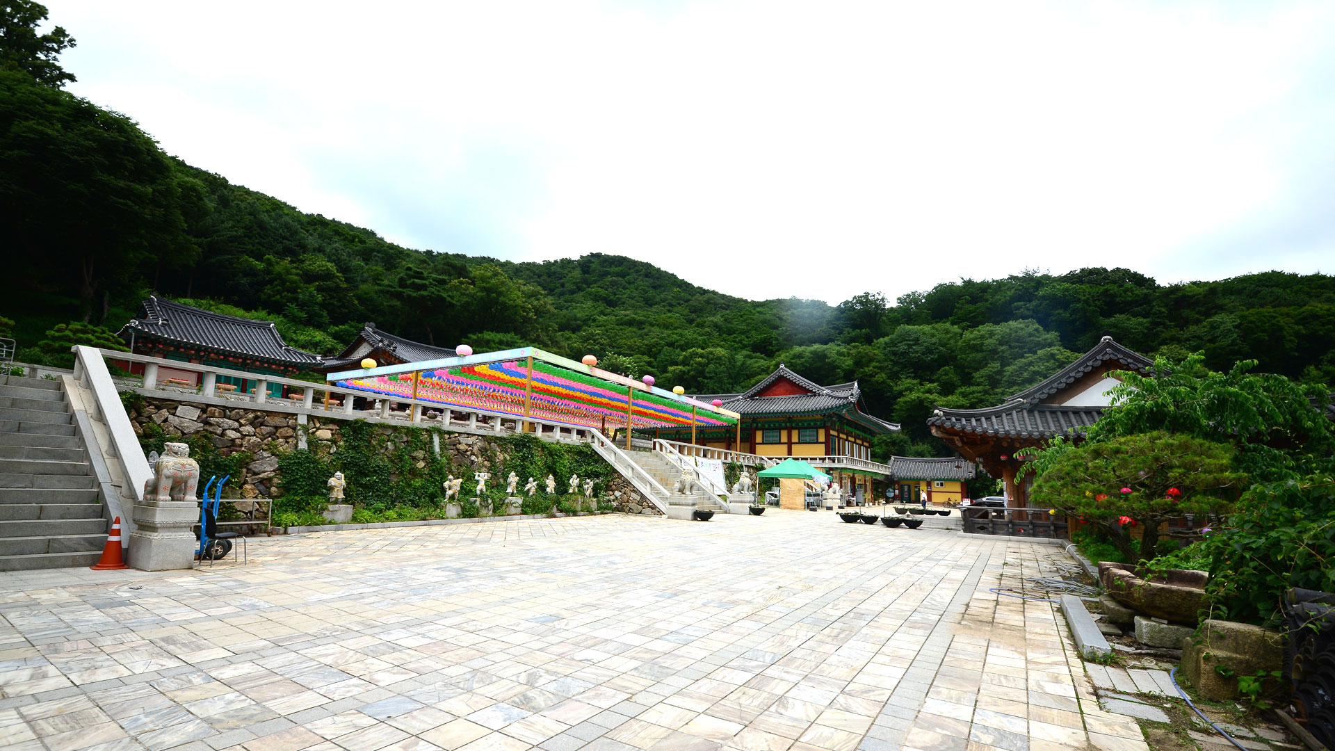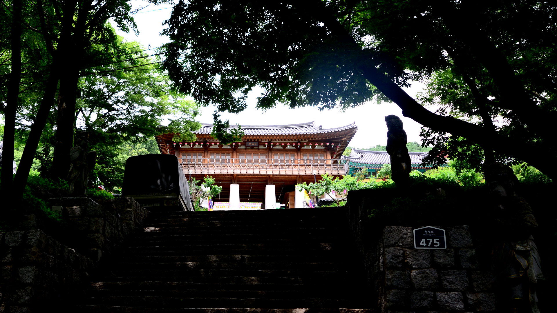 청게사는 일주문이 없고 진입 계단 좌 우에 석조 사천왕이 자리하고있다