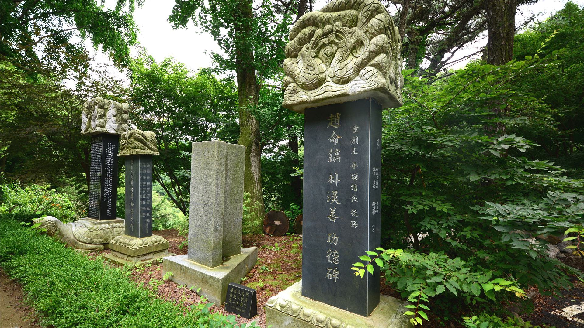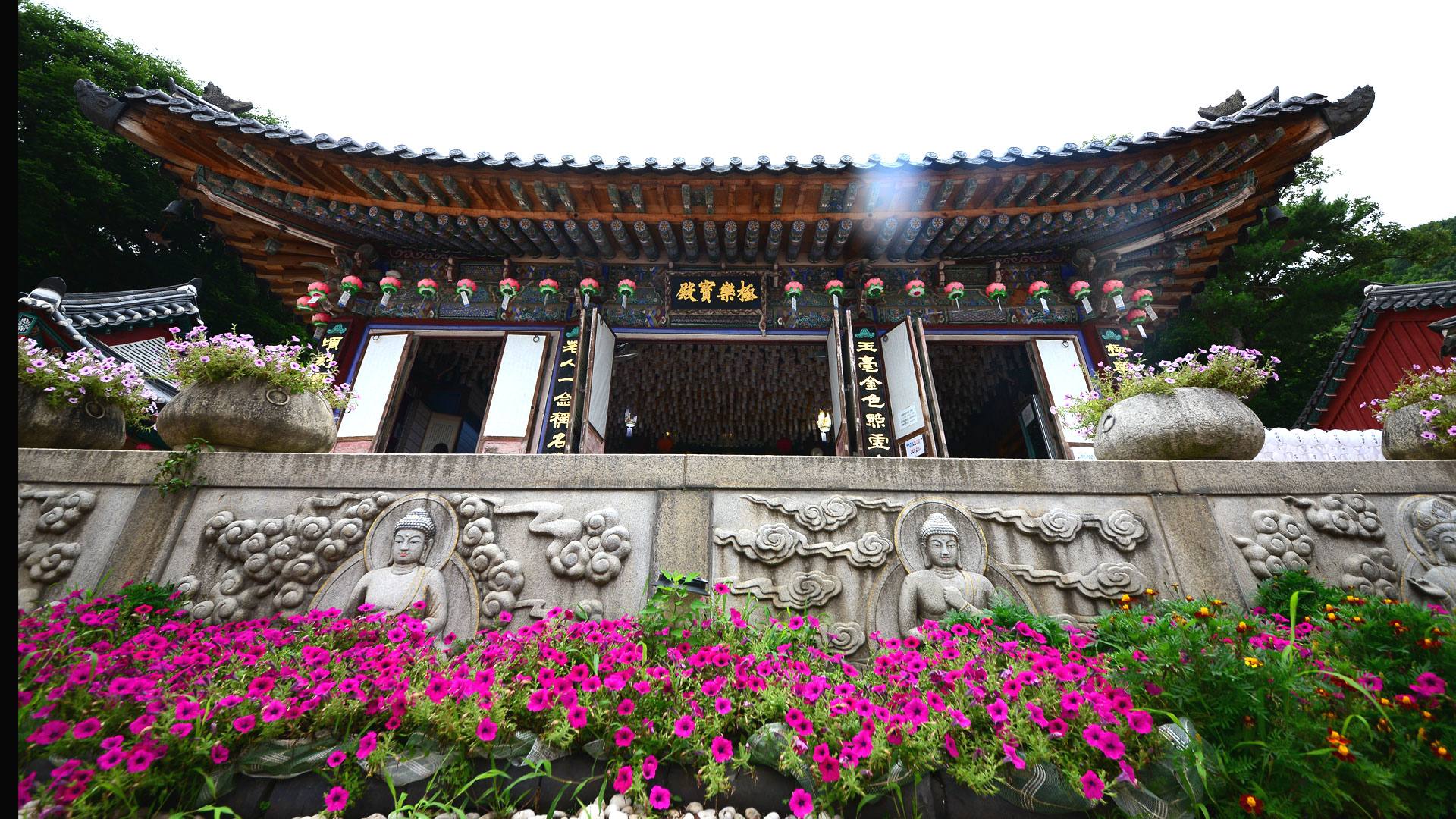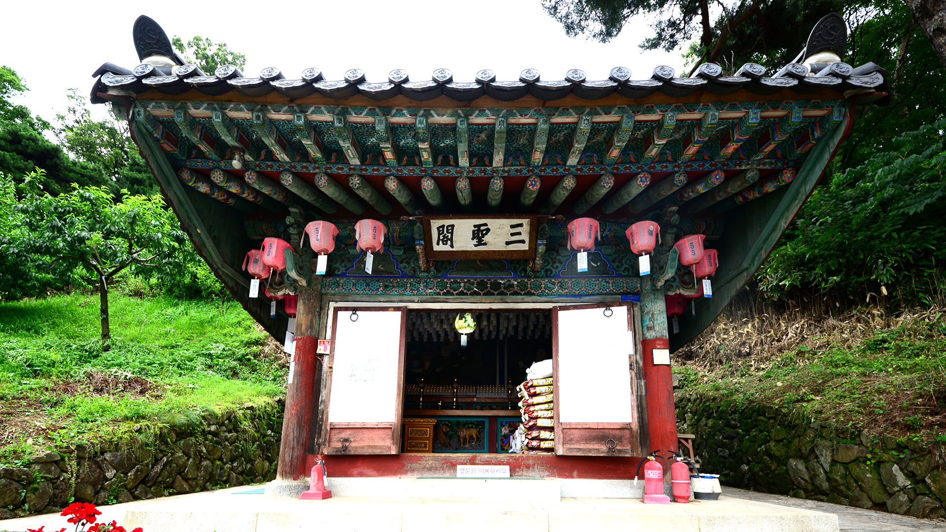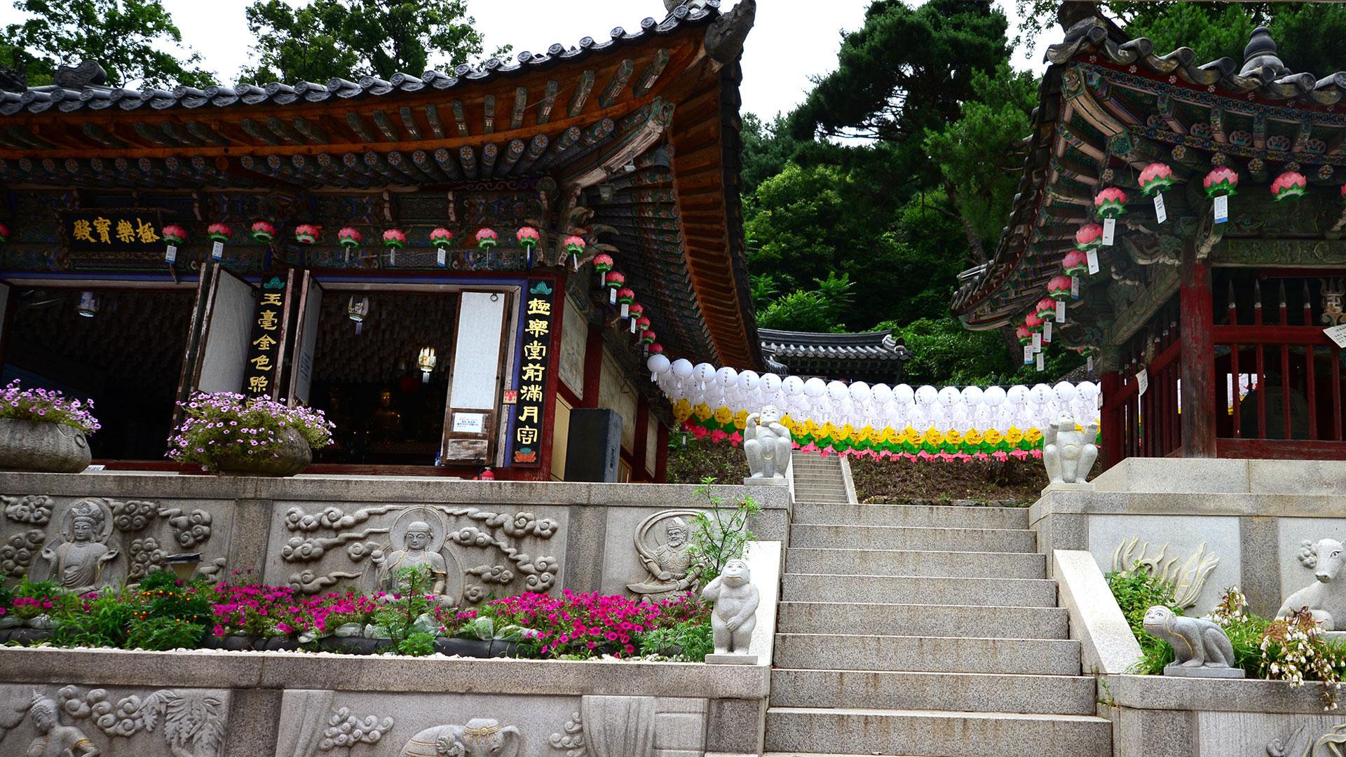 청게사는 일주문이 없고 진입 계단 좌 우에 석조 사천왕이 자리하고있다