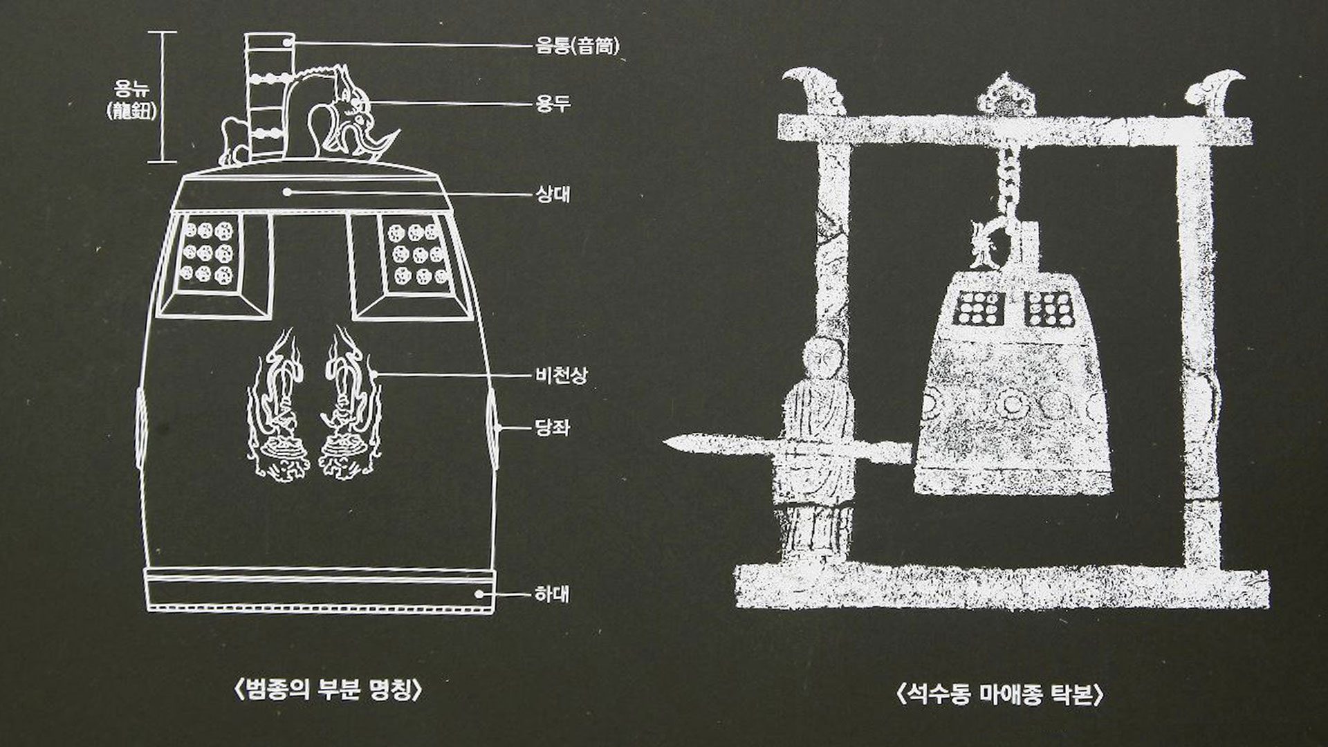가사를 걸친 한 승려가 사각형의 목가(木架)에 쇠사슬로 매달아 놓은 종을 당목(幢木 : 종을 치는 나무 막대)을 잡고서 치고 있는 모습을 묘사한 것이다. 종신(鐘身)은 아랫부분이 약간 벌어진 형태로 상대와 하대의 문양대를 갖추고 있으며, 종의 정상에는 용모양의 고리[龍鈕]와 음통(音筒)을 갖추고 있다.